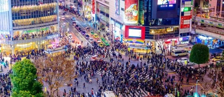 Which city features neon-lit Shibuya Crossing?