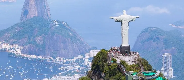 Which city guards Christ the Redeemer statue atop a peak?