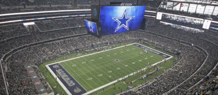 Which NFL team plays at AT&T Stadium, known for its massive video screen?